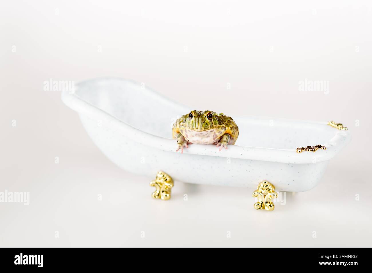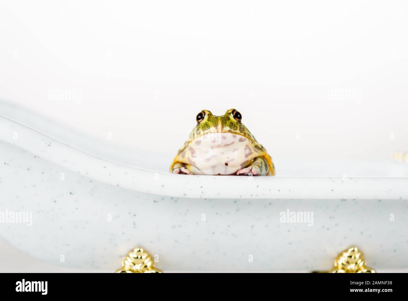 Cute Green Frog In Small Luxury Bathtub Isolated On White Stock Photo Alamy
